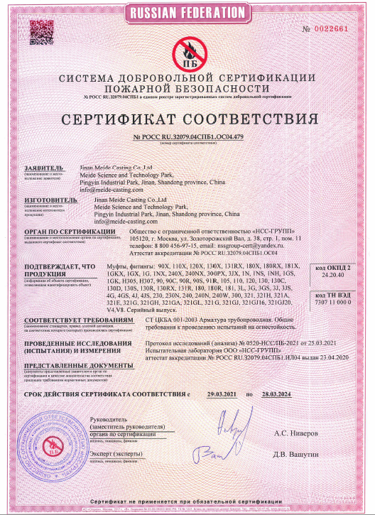 Meide Group got the Russian mandatory fire & safety certificate for strainer and grooved fitting product.