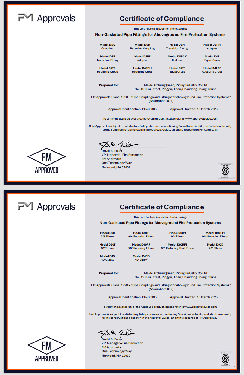 Meide Group's ductile iron grooved fittings in models 1G 457, 4G 273x76 / 273x114, and 4J 273x48 / 273x60 are FM approved.