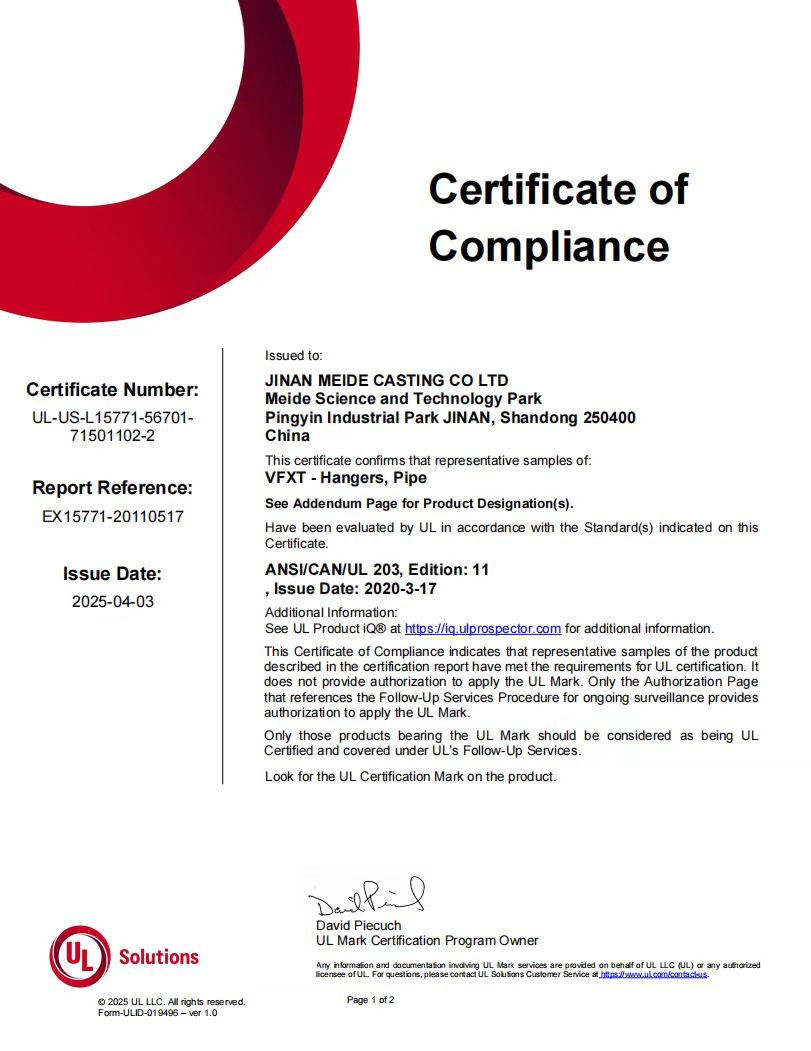 The Seismic Supports of MEIDE GROUP has obtained UL certification