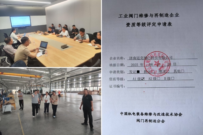 2025年8月20日,im电竞向中机维协阀门再制造分会提交了“工业阀门维修与再制造企业资质等级评定申请表”,分别申请了:驱动/自动阀门、控制阀门、阀门驱动装置三个类别。2025年9月4日-5日,中机维协阀门再制造分会派遣专家评审组对im电竞进行了运维、维修与改造资质现场评审。