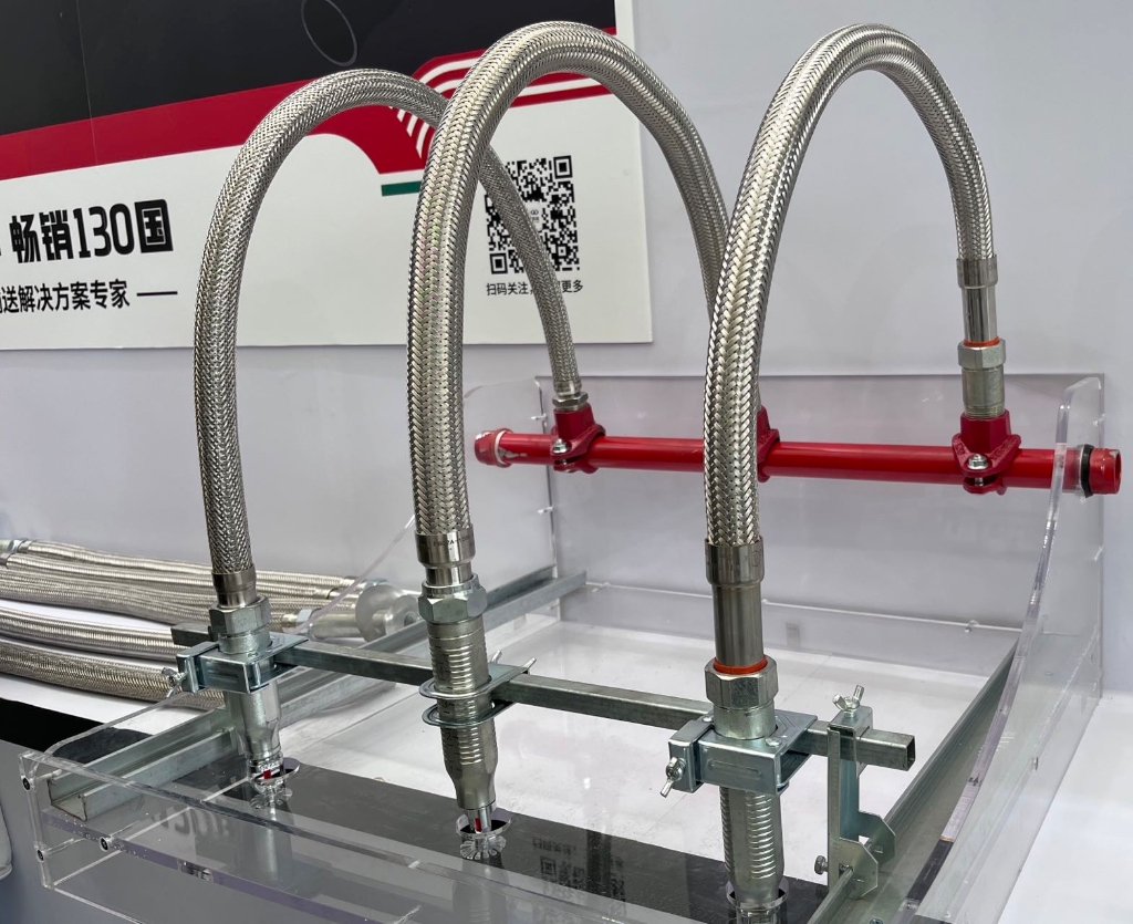 消防金属软管专业名称为消防洒水软管,主体材质不锈钢,包含不锈钢软管(即波纹管)和安装组件,用于自动喷淋系统中喷淋头与主管的连接,代替传统硬管。玫德艾瓦兹消防软管具备独特优势: