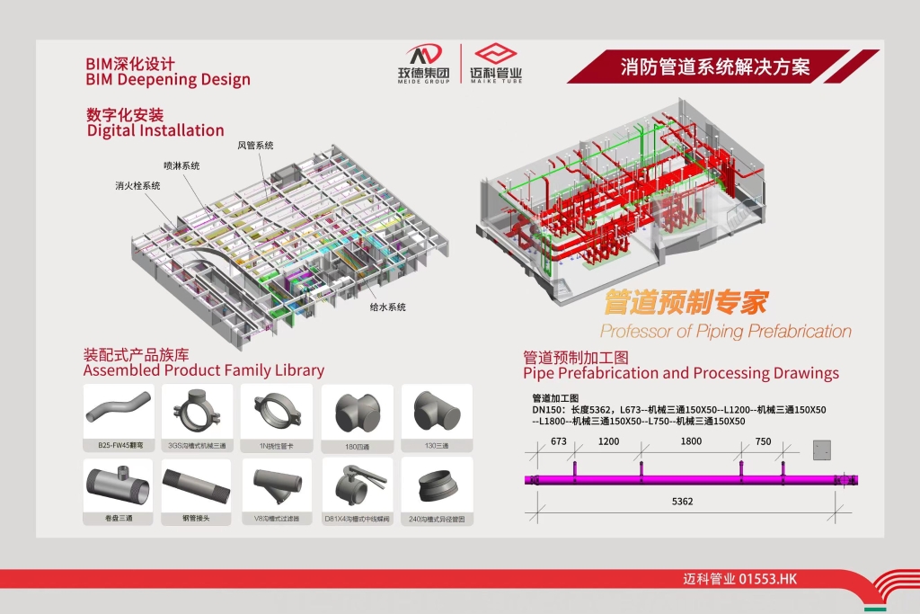 玫德有独立的装配式预制加工车间,配备专业的技术人员,根据项目工程及安装要求,定制优化流体系统解决方案。通过精密的加工设备,从截管、套丝、压槽基本完全实现自动化预制加工,将原材料加工组合成系统所需的各种规格型号,实现订单式加工模式。工厂预制加工比传统现场二次加工产品合格率更高,材料加工损耗降低5%以上。