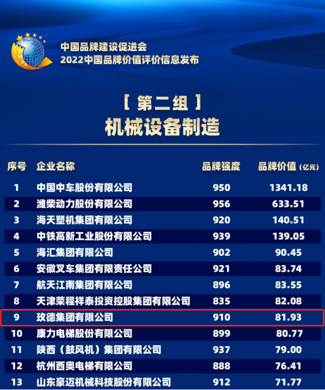 im电竞在“机械设备制造组”荣获第九名,品牌强度910,品牌价值81.93亿元,品牌强度相较2021年的887增长了23,品牌价值由2021年的73.16亿元,增长了8.77亿元。
