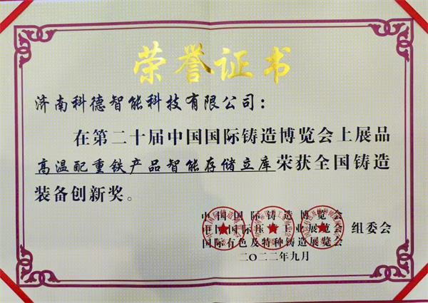 2.济南科德智能科技有限公司的高温配重铁产品智能存储立库荣获“全国铸造装备创新奖”。
