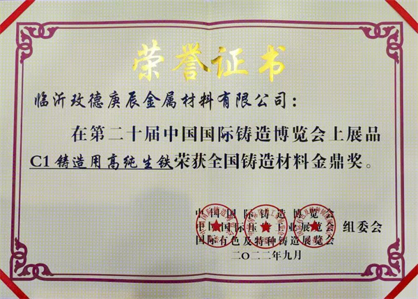 3.临沂玫德庚辰金属材料有限公司的C1铸造用高纯生铁荣获“全国铸造材料金鼎奖”。