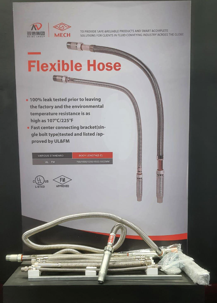 消防金属软管专业名称为消防洒水软管,主体材质不锈钢,包含不锈钢软管(即波纹管)和安装组件,用于自动喷淋系统中喷淋头与主管的连接,代替传统硬管。玫德艾瓦兹消防软管具备独特优势: