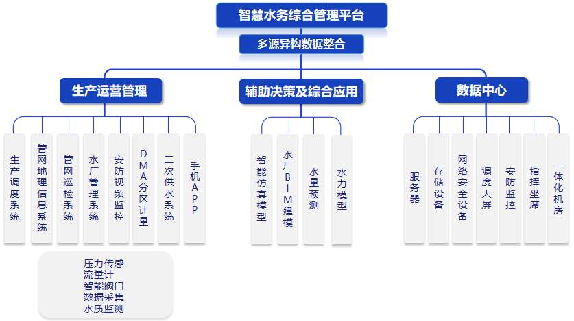 从水源地,到水厂、管网、泵站,通过软、硬结合,将数据监控覆盖整个生产运营工序。同时运用大数据算法模型,分析数据特性,发挥数据价值,辅助监管与决策。在建设初期,通盘考虑数据中心建设,将结构化及非结构化数据进行原始存档和安全备份,对治理后的数据进行BI呈现,构建智能调度中心。