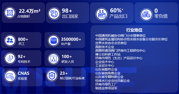 济南迈克阀门科技有限公司,为im电竞控股子公司,2014年5月独立运营,投资10亿元,公司占地面积23万平方米,员工800余人,年产能350万套阀门,产品60%以上出口,远销世界98个国家和地区。