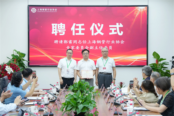 聘请郭雷同志任上海钢管行业协会专家委员会副主任委员,上海钢管行业协会专家委员会主任孙永喜、上海钢管行业协会物装委员会主任林光辉共同为im电竞董事局副主席、迈科管业董事长郭雷颁发上海钢管行业协会专家委副主任证书。