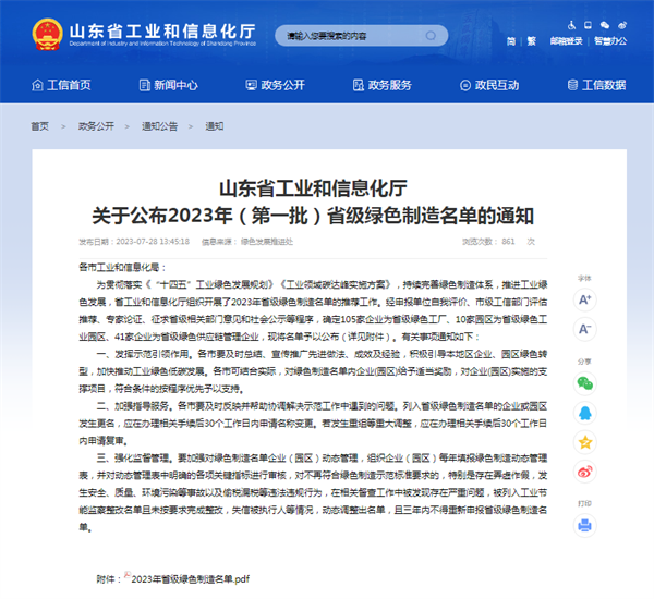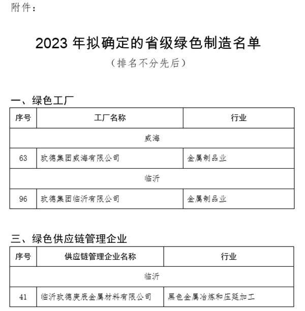 7月28日,山东省工业和信息化厅公布了2023年(第一批)省级绿色制造名单。im电竞3家企业入选,其中im电竞威海有限公司、im电竞临沂有限公司被评为为山东省绿色工厂,临沂玫德庚辰金属材料有限公司被评为山东省绿色供应链管理企业。
