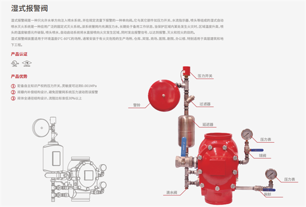 湿式报警阀为全通道低流阻设计;配备自主知识产权的压力开关,灵敏度可达到0.01MPa;采用内补偿结构,防泄露,防止误报警;阀座、阀瓣采用船舶用锡青铜材质,耐腐蚀能力极强,可以做到在海水中浸泡1年无任何锈蚀,在腐蚀性介质中仍可正常工作;阀轴采用不锈钢+表面硬化处理,启闭次数可达20万次以上;获得国内外权威认证:UL、FM、VDS、CE、CCCF。
