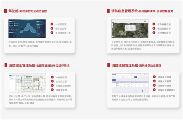 智慧消防解决方案集安全监管、应急救援、维保管理于一体,实现消防监测单位全时段、可视化、智能化管理。为客户提供完整的智慧消防整体解决方案;产品设计融入大数据理念,拥有自动分析功能;系统、设备接口丰富,支持用户原有系统对接、智能设备接入。
