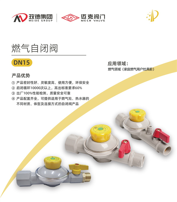 迈克牌管道燃气自闭阀符合 CJ /T447-2014标准要求,是中华人民共和国建设部、中国城市燃气协会重点推广的新一代燃气安全防护产品。燃气自闭阀安装在户内燃气管道,具有超压自动关闭、欠压自动关闭、过流自动关闭功能,通过识别燃气管路中压力及流量的异常变化,及时切断供气,防止燃气泄漏事故发生,保障用户用气安全。产品密封性好、灵敏度高、动作可靠、使用方便,无功耗、无污染,性能安全可靠。