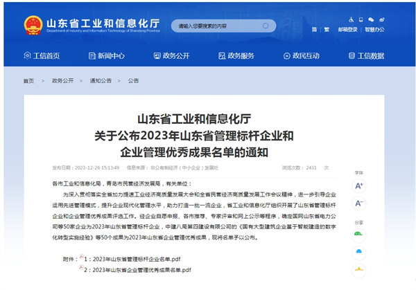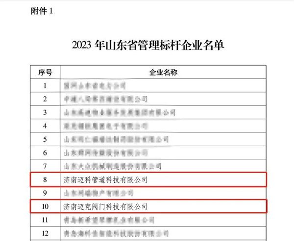 2023年12月25日山东省工业和信息化厅发布《关于公布2023年山东省管理标杆企业和企业管理优秀成果名单的通知》,公布im电竞旗下济南迈科管道科技有限公司、济南迈克阀门科技有限公司均顺利通过2023年山东省管理标杆企业认定。