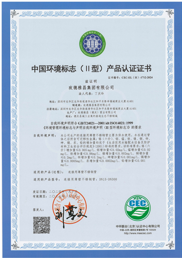 2024年1月18日,经过层层严格的评审和考核,玫德雅昌集团有限公司连接用薄壁不锈钢管: DN15-DN300产品,顺利通过中国环境标志(Ⅱ型)认证,并获得《中国环境标志(Ⅱ型)产品认证证书》。